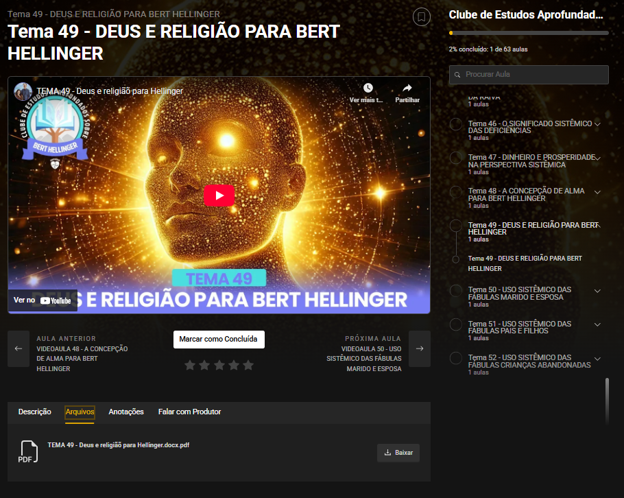 Todo o conteúdo já está 100% disponível para acesso imediato, organizado em 52 temas e 347 tópicos, oferecendo uma visão clara, estruturada e profunda da obra de Bert Hellinger e das dinâmicas sistêmicas que atravessam a vida humana.