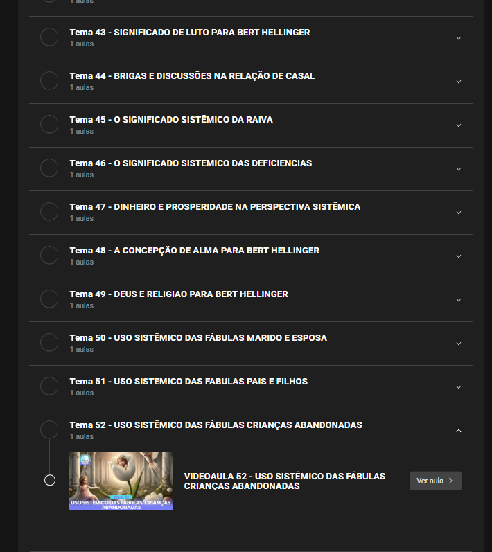 2️⃣ Aulas organizadas por módulos e temas – Cada tema aborda uma dinâmica sistêmica específica (pais e filhos, casal, emoções, prosperidade, alma, religião, fábulas, entre outros).